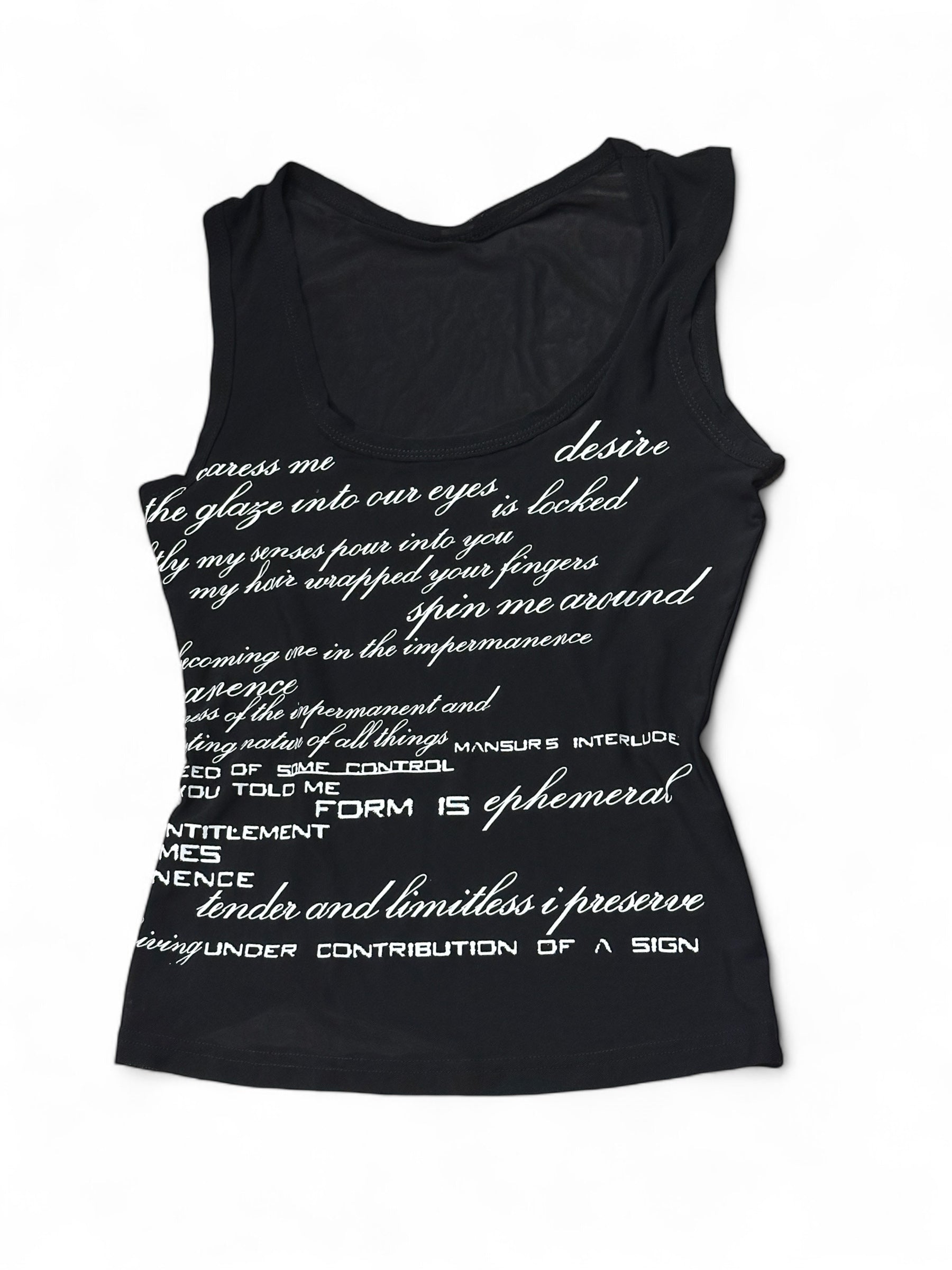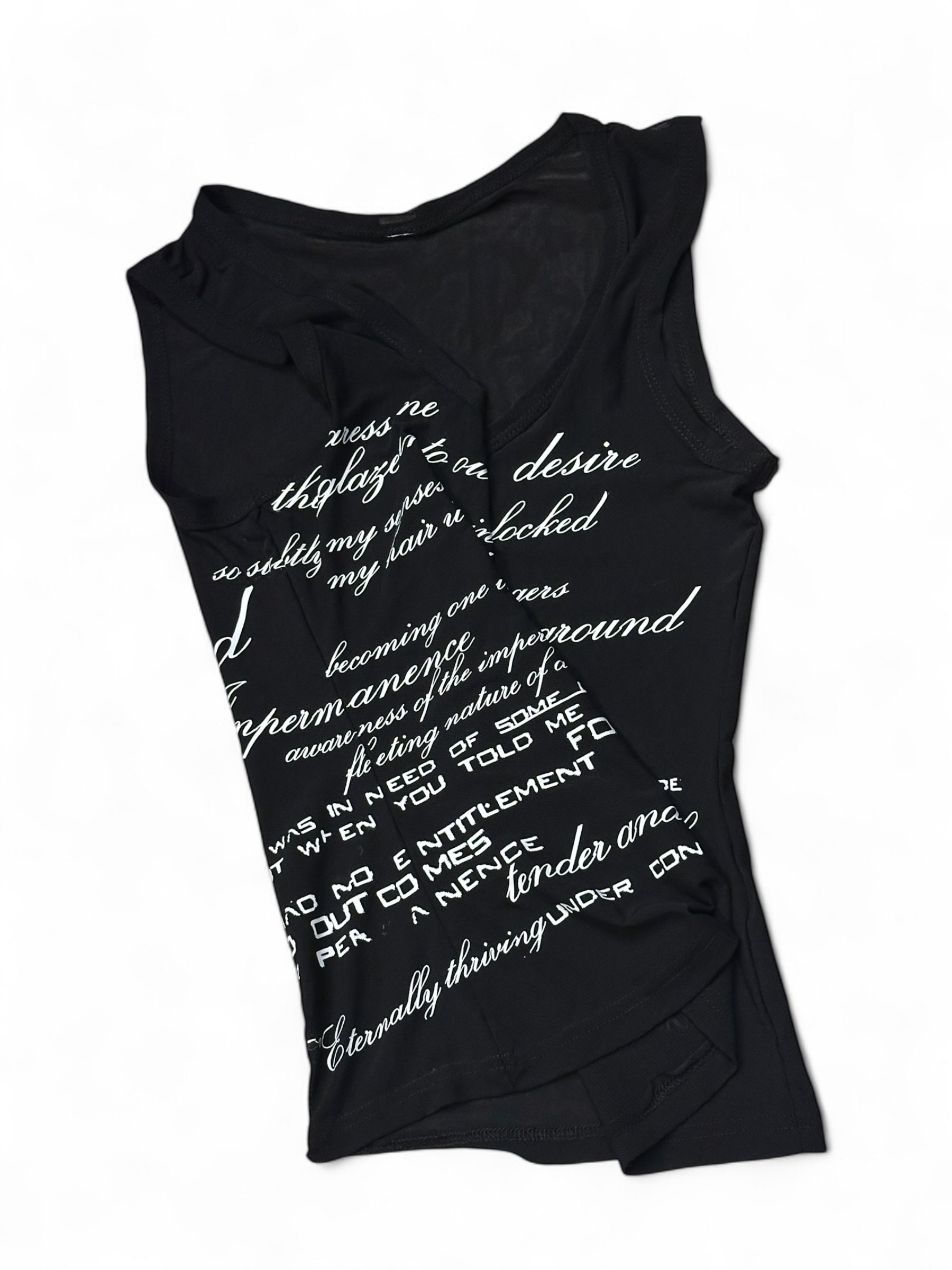 Subtle yet expressive. Sheer black mesh fabric infused with star's personal journal wording. Tenderness, Desire, Impermanence and Ephemeral Form. A Synthesis in name of STAR SIGNED.