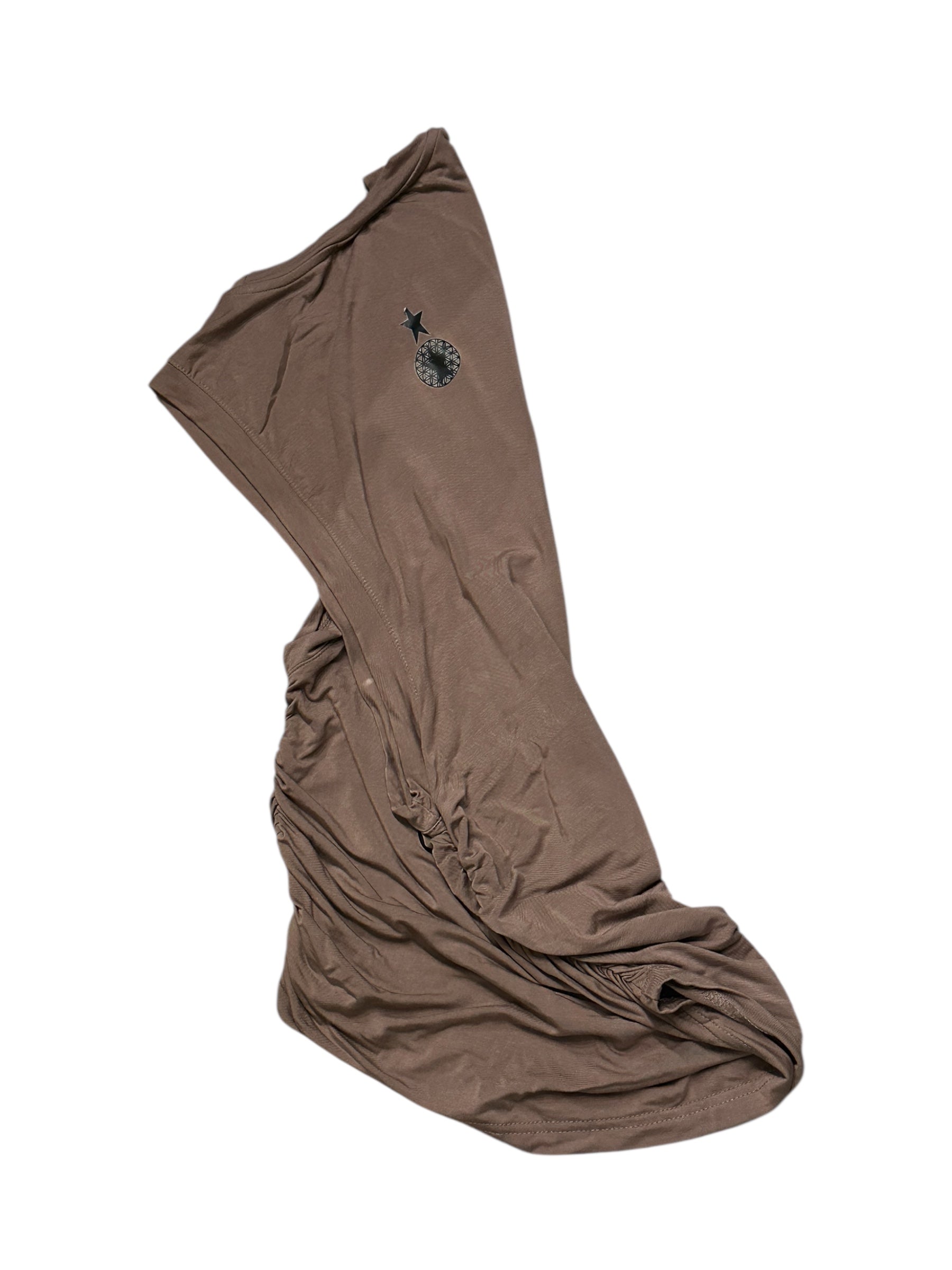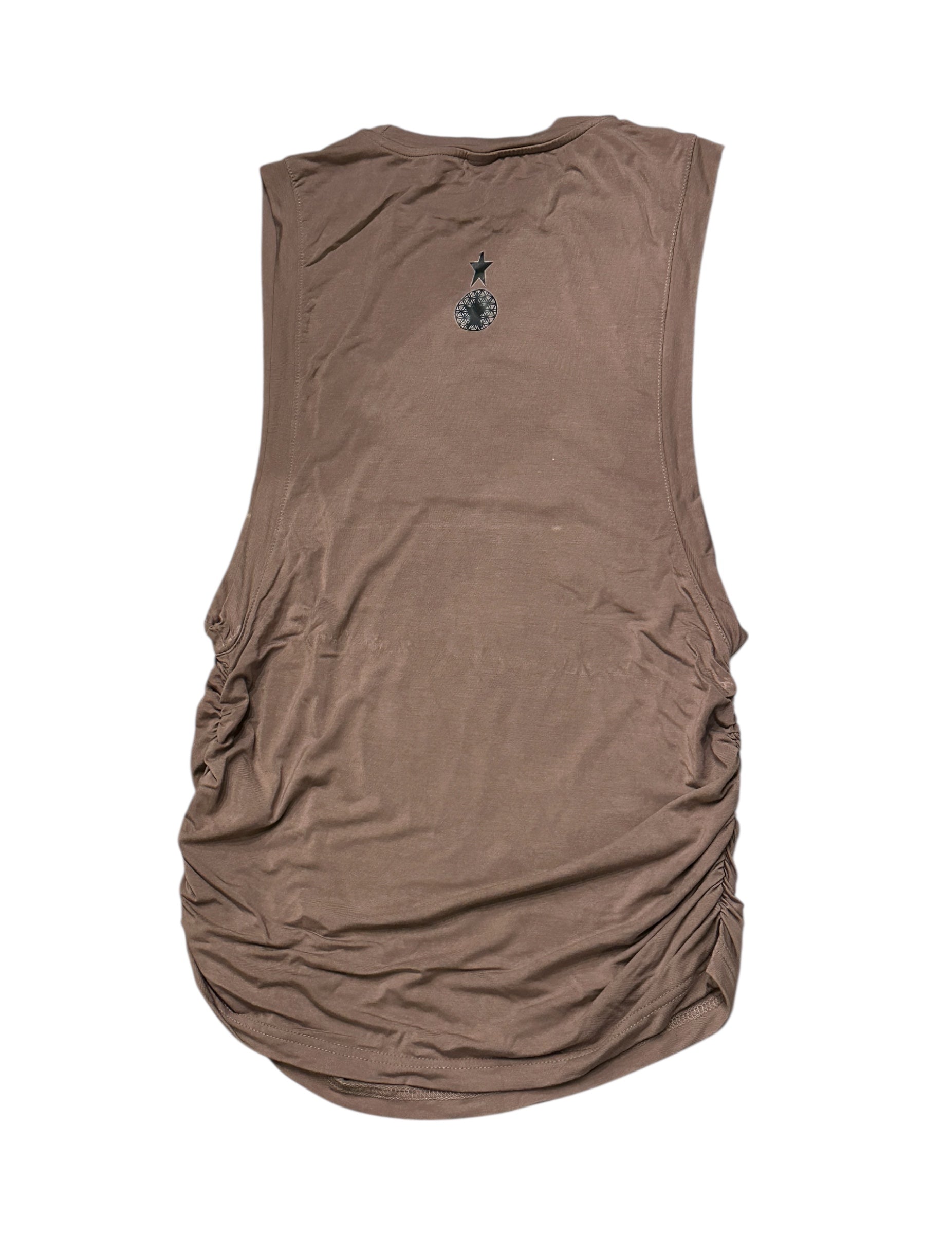 This flattering low-cut side top incorporates a bold front statement print, as well as a contemporary flower of life print on the back. A synthesis.